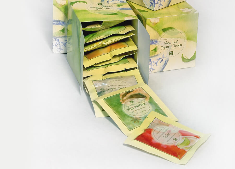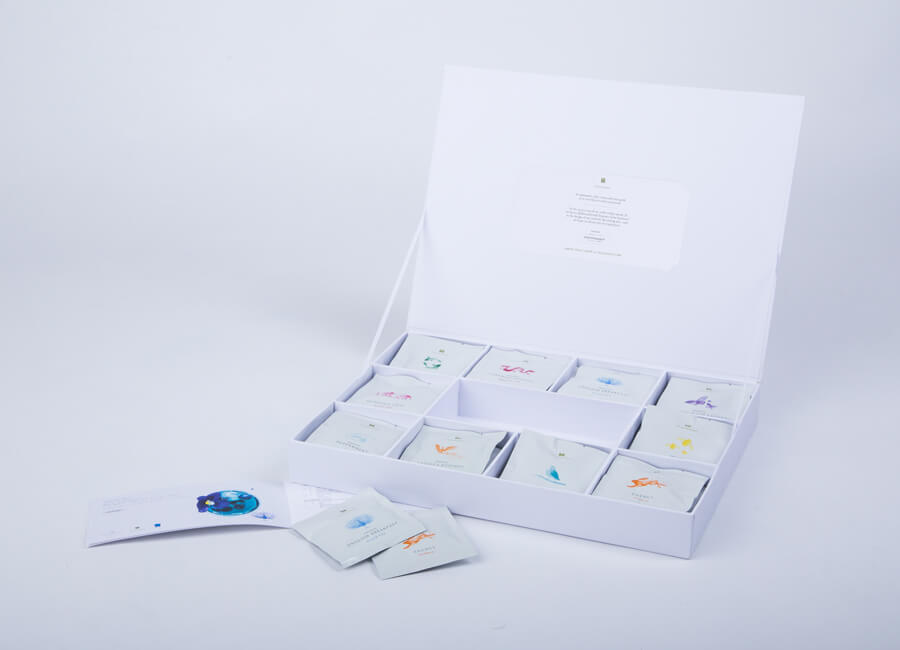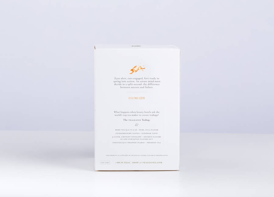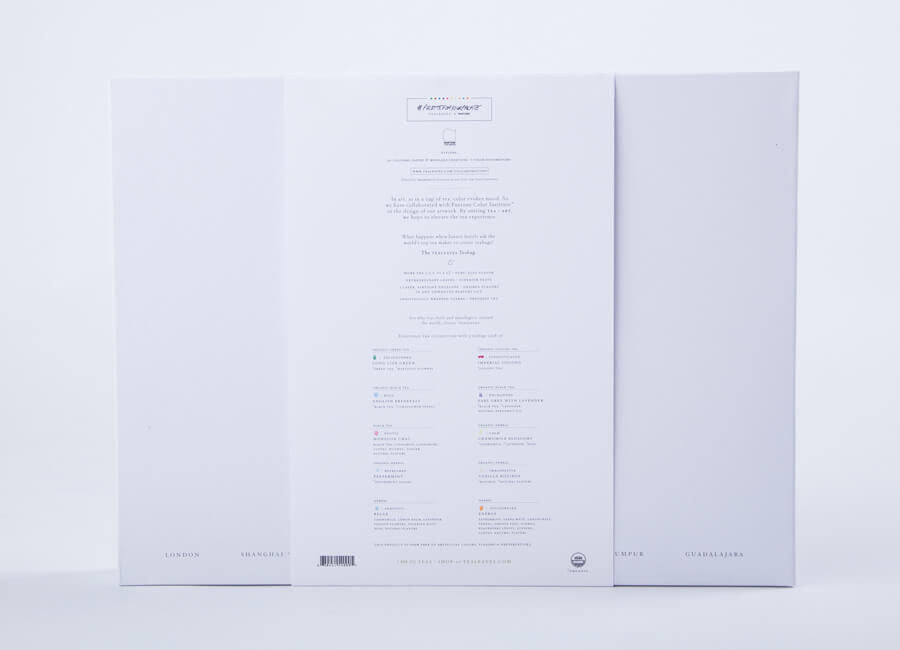 With the team, we set to work on designing a total of ten tea envelopes, ten retail boxes, ten mastercases, and a gift box. We explored various box options, paper textures, and specialty printing techniques. A standout design was a tall, matchbox-style box with sliding drawers which would allow for access to the teas from either side. Cafes and restaurants can puncture the bottom for easy accessibility for the teas. Selective areas were blind embossed for an elevated appearance.